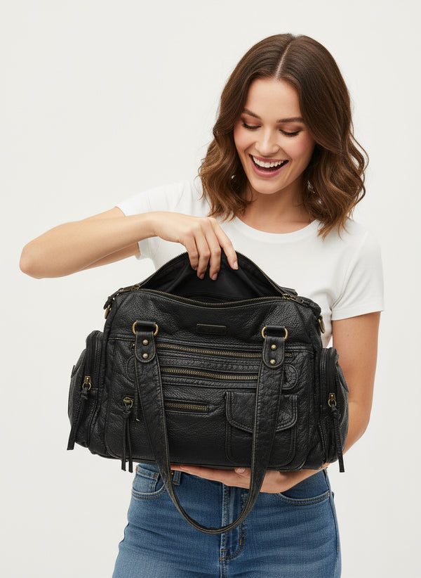 Sac à Bandoulière Vintage Femme – Cuir Élégant avec Poches Zippées